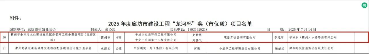 近日,河北省廊坊市建筑業(yè)協(xié)會(huì)公示了《關(guān)于公布2025年度廊坊市建設(shè)工程“龍河杯”獎(jiǎng)(市優(yōu)質(zhì))工程項(xiàng)目名單的通知》,公司監(jiān)理的霸州市全市污水處理設(shè)施及配套管網(wǎng)工程全覆蓋項(xiàng)目(北部區(qū)域),憑借高標(biāo)準(zhǔn)的質(zhì)量管控體系與創(chuàng)新實(shí)踐的管理模式成功入選,榮膺廊坊市優(yōu)質(zhì)工程“龍河杯”獎(jiǎng)。