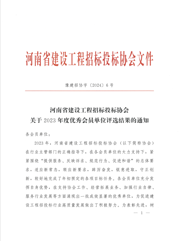 近日,河南省建設(shè)工程招標(biāo)投標(biāo)協(xié)會(huì)公布了“2023年度優(yōu)秀會(huì)員單位評(píng)選結(jié)果的通知”,河南省招標(biāo)投標(biāo)協(xié)會(huì)公布了“關(guān)于表彰2023年度誠(chéng)信自律建設(shè)先進(jìn)單位、先進(jìn)個(gè)人的決定”。