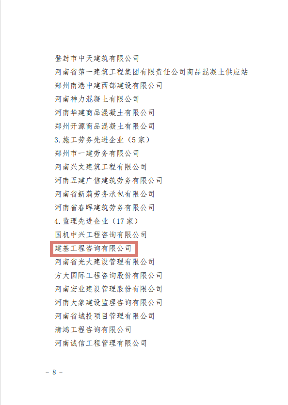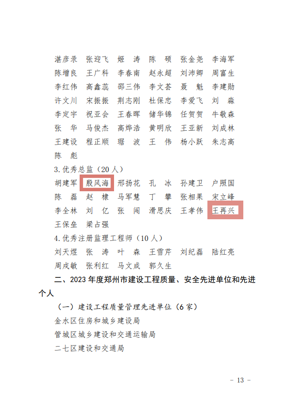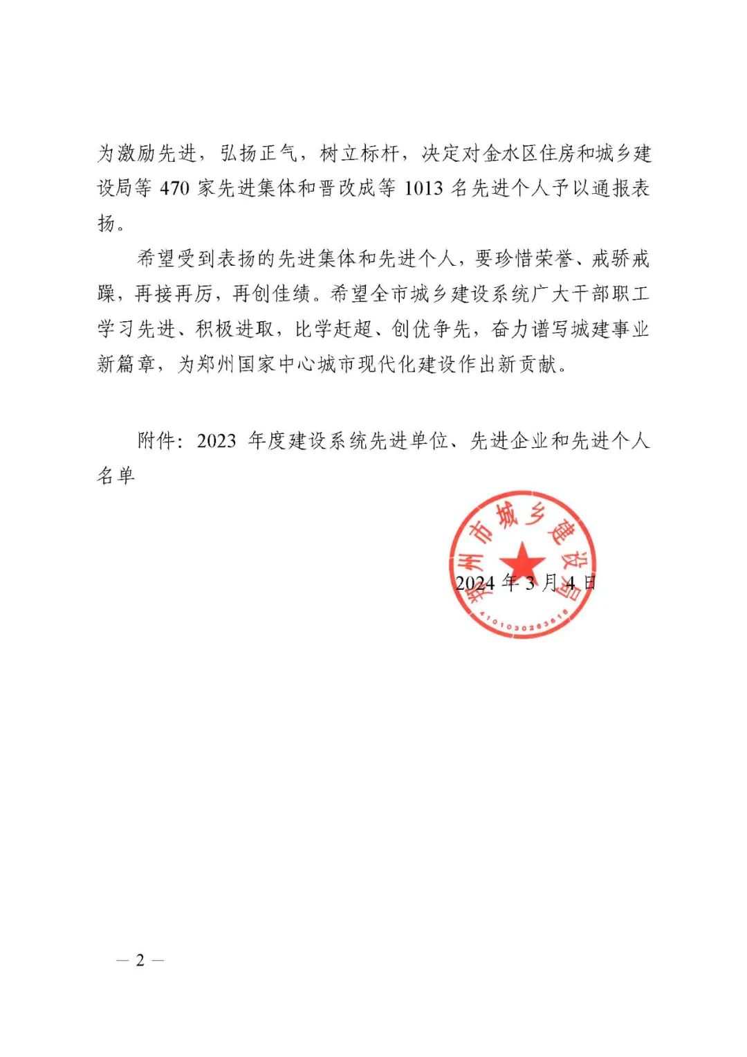 近日,鄭州市城鄉(xiāng)建設(shè)局發(fā)布了《鄭州市城鄉(xiāng)建設(shè)局關(guān)于表?yè)P(yáng)2023年度建設(shè)系統(tǒng)先進(jìn)單位先進(jìn)企業(yè)和先進(jìn)個(gè)人名單的通報(bào)》,公司入選先進(jìn)企業(yè)榜單,公司總監(jiān)殷鳳海、王再興榮獲優(yōu)秀總監(jiān)榮譽(yù)稱號(hào)。