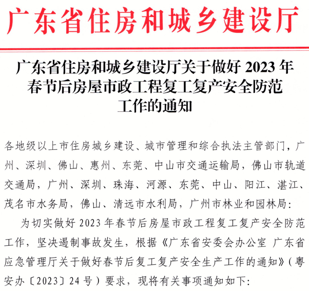 近日,廣東省住建廳發(fā)布《廣東住建廳關(guān)于做好2023年春節(jié)后房屋市政工程復(fù)工復(fù)產(chǎn)安全防范工作的通知》。