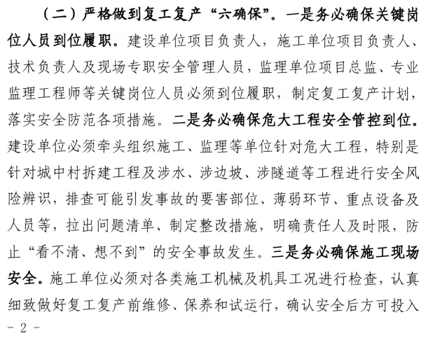建設(shè)單位項(xiàng)目負(fù)責(zé)人,施工單位項(xiàng)目負(fù)責(zé)人、技術(shù)負(fù)責(zé)人及現(xiàn)場(chǎng)專職安全管理人員,監(jiān)理單位項(xiàng)目總監(jiān)、專業(yè)監(jiān)理工程師等關(guān)鍵崗位人員必須到位履職,制定復(fù)工復(fù)產(chǎn)計(jì)劃,落實(shí)安全防范各項(xiàng)措施。