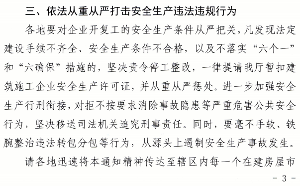 各地要對(duì)企業(yè)開復(fù)工的安全生產(chǎn)條件從嚴(yán)把關(guān),凡發(fā)現(xiàn)法定建設(shè)手續(xù)不齊全、安全生產(chǎn)條件不合格,以及不落實(shí)“六個(gè)一”和“六確保”措施的,堅(jiān)決責(zé)令停工整改,一律提請(qǐng)我廳暫扣建筑施工企業(yè)安全生產(chǎn)許可證,并從重從嚴(yán)懲處。
